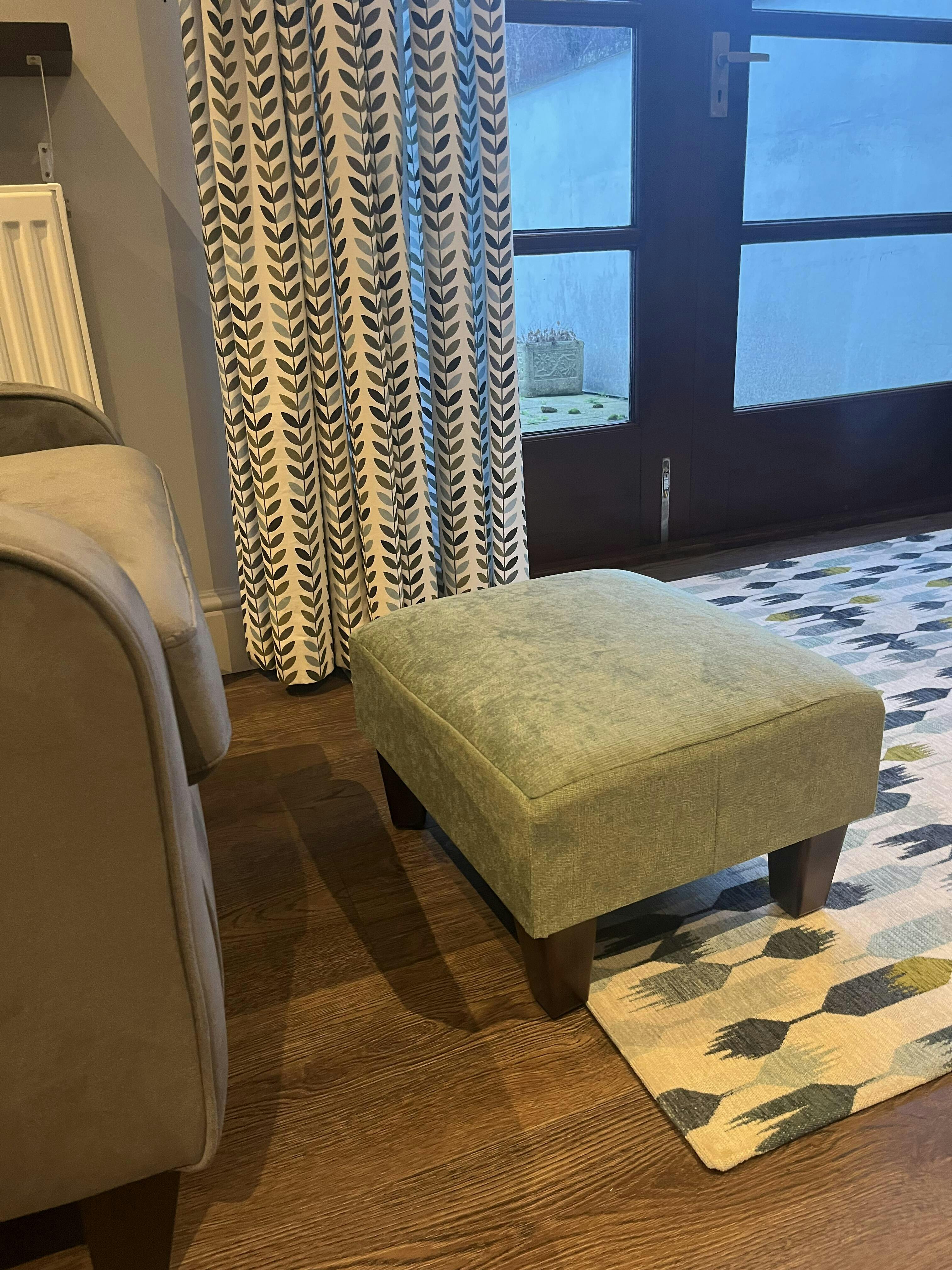 I’m delighted with my footstool in Marine, with light wood legs. The delivery time was much faster than I’d expected and the quality of this footstool is outstanding. The fabric samples were a great help in making my final decision and the colour complements my dark blue sofa perfectly. I highly recommend this lovely footstool to anyone who is still undecided. On a final note the size was just perfect for me.